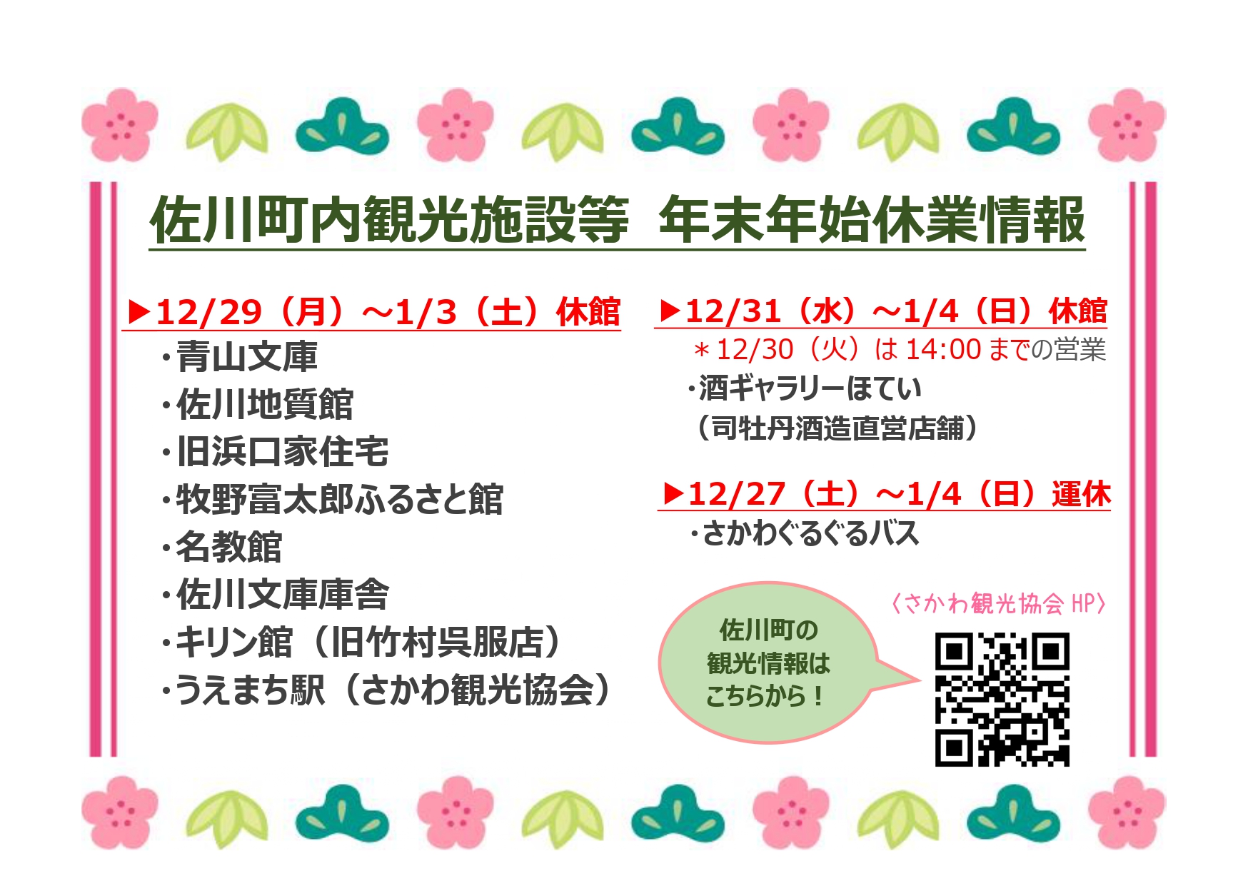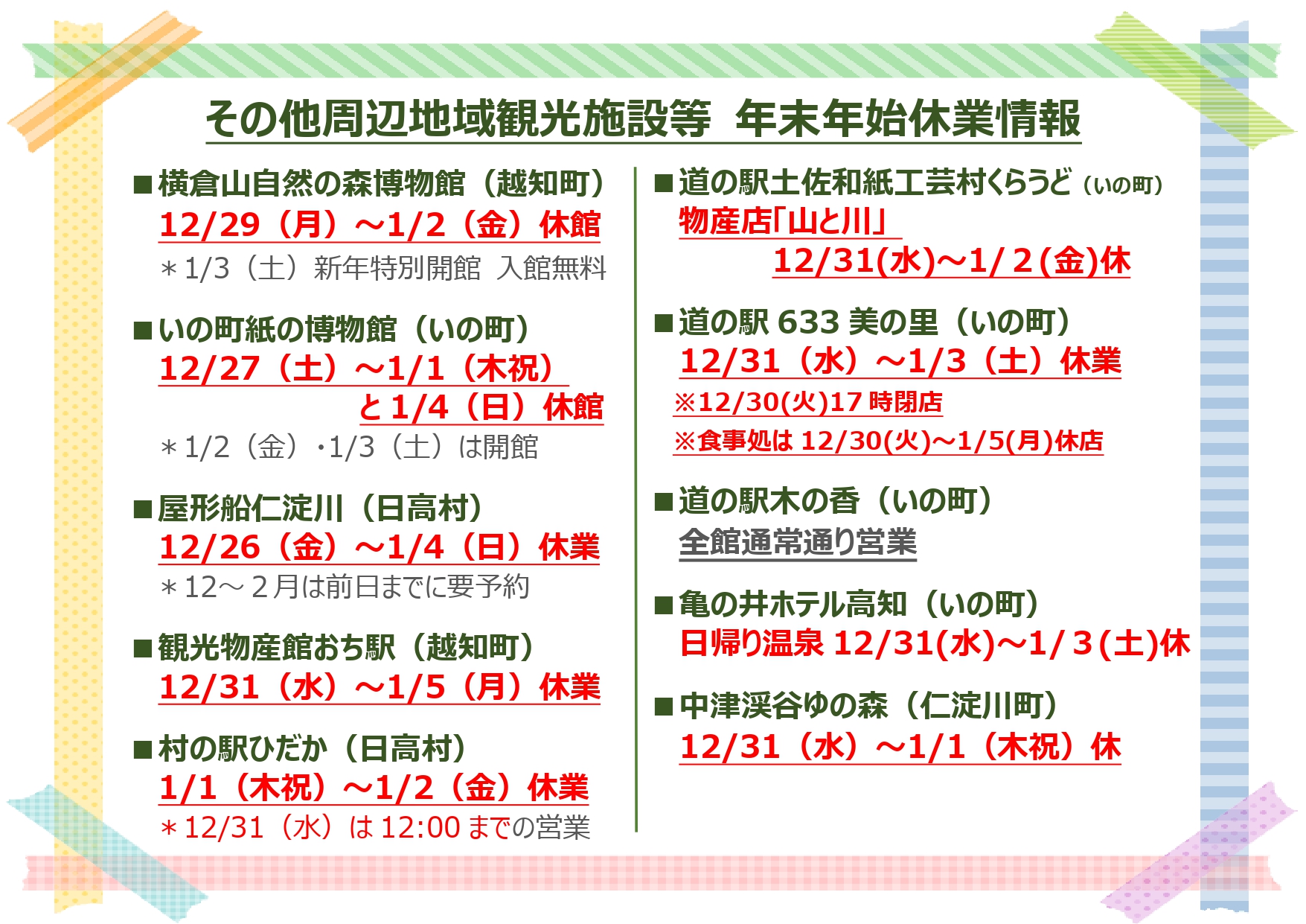 道の駅のある佐川町をはじめ、道の駅周辺 仁淀川流域市町村の観光施設等の年末年始の営業についてお知らせします。(全てではありません)年始には特別開館する施設などもあります!年末年始のおでかけの際にご参考くださいませ。