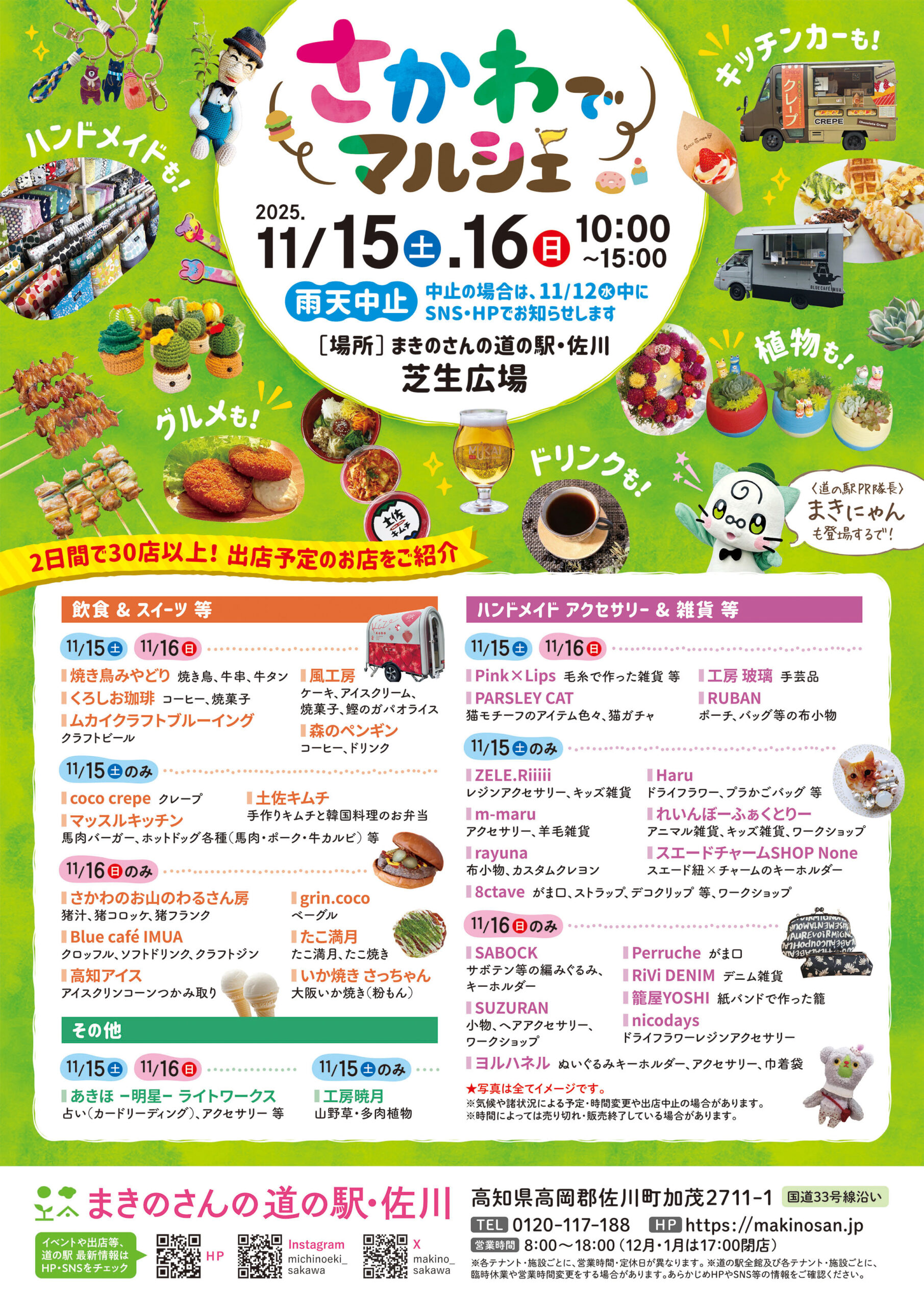 佐川町内外から2日間で30店以上のお店が集結します!もちろん、当道の駅PR隊長まきにゃんも2日間登場予定!お天気に恵まれることを祈りつつ、楽しい・美味しい2日間を道の駅で過ごしましょう!