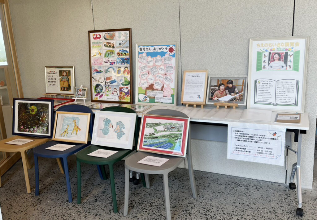 6月に町内の「さくら福祉事業所」で1週間ほど展示したところ、当時「見に行けなくて残念」とのお声もあり、そこから町内各所で巡回展示を続けていました。この度、素敵な作品の数々が道の駅にもやって来ます。智恵さんのやさしくてあたたかい作品に会いに来てください。