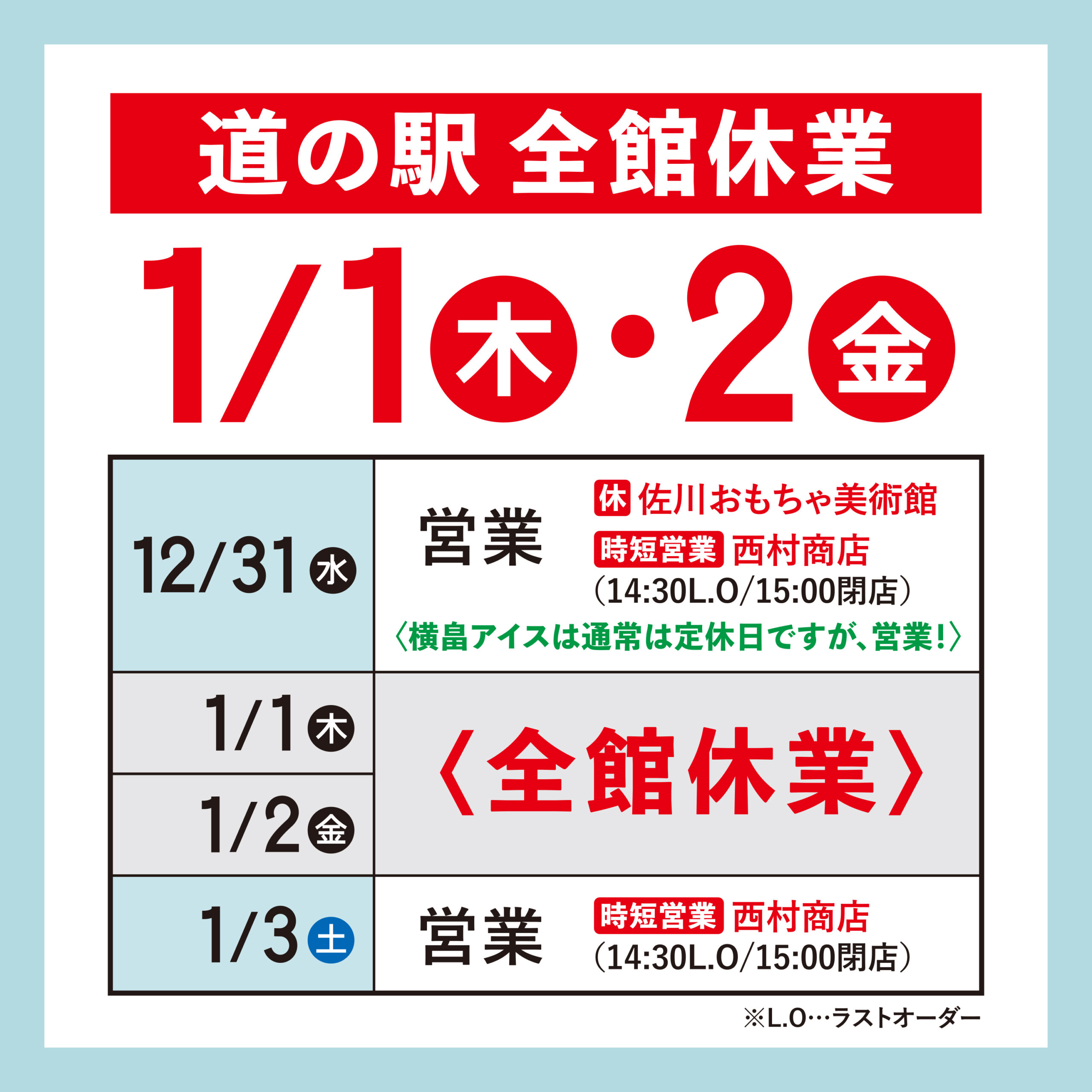 〈年末年始 道の駅全館休業日〉2026年1月1日(木)、2日(金)