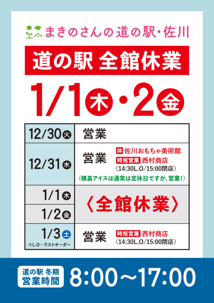 年始めに2日間のお休みをいただきますが、年末も年明け1/3(土)からも皆さまのお越しをお待ち申し上げております。年末の買い出しや帰省のお土産等、ぜひ道の駅でお買い物やお食事をお楽しみください。