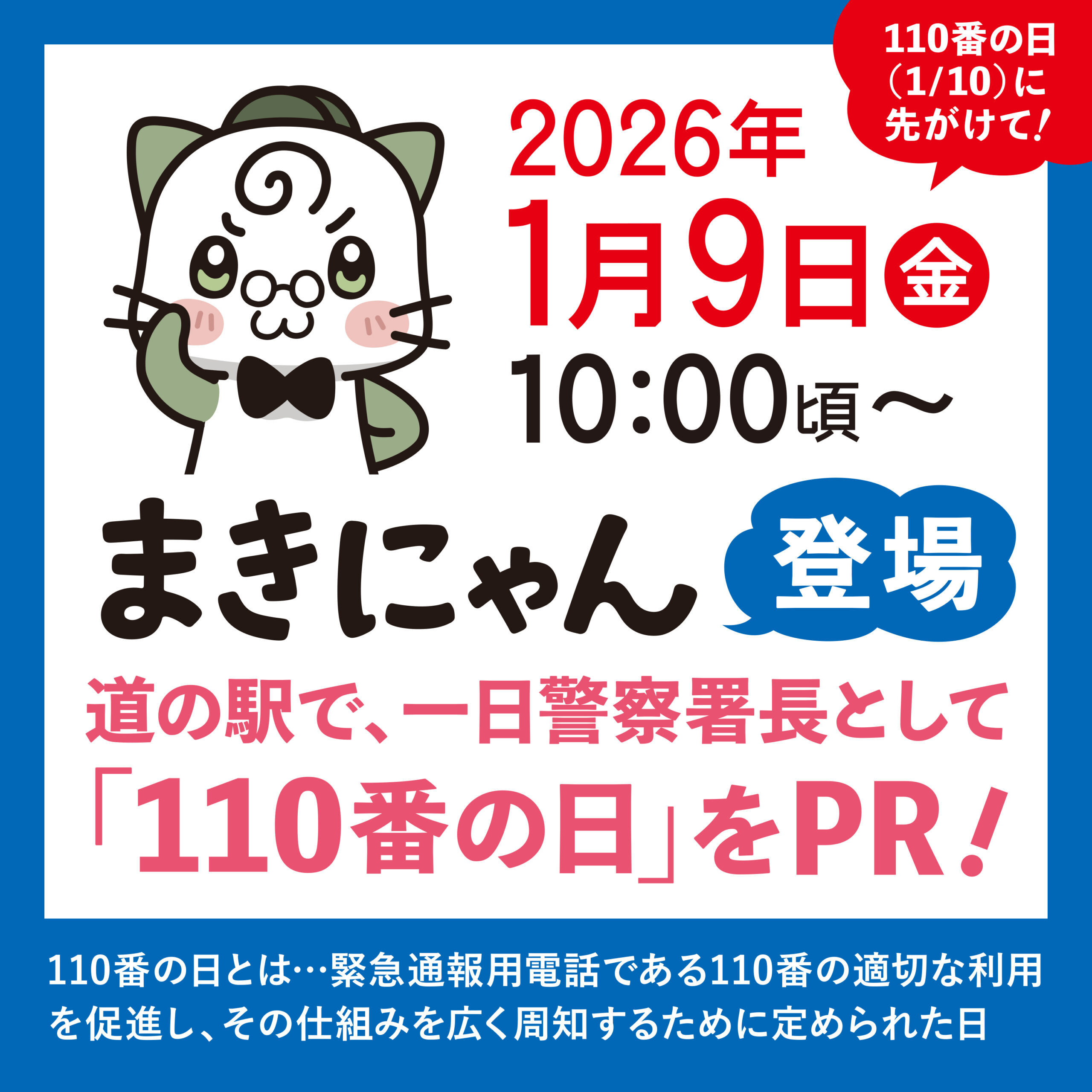 「110番の日(1/10)」に先がけて2025年1月9日(金)、当道の駅PR隊長(非公認)まきにゃんが佐川警察署の皆さんと110番通報の適切な利用についてPR活動を行います。