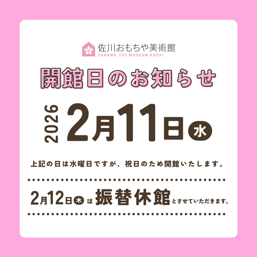 道の駅併設の「佐川おもちゃ美術館」について、2026年2月11日(水)は水曜日(通常休館日)ですが、祝日のため開館いたします。