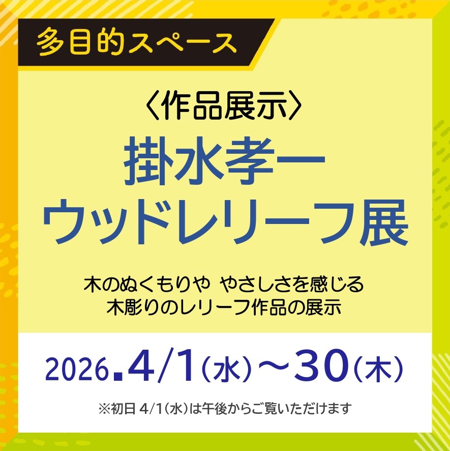 〈多目的スペース〉4/1(水)~30(木)掛水孝一ウッドレリーフ展