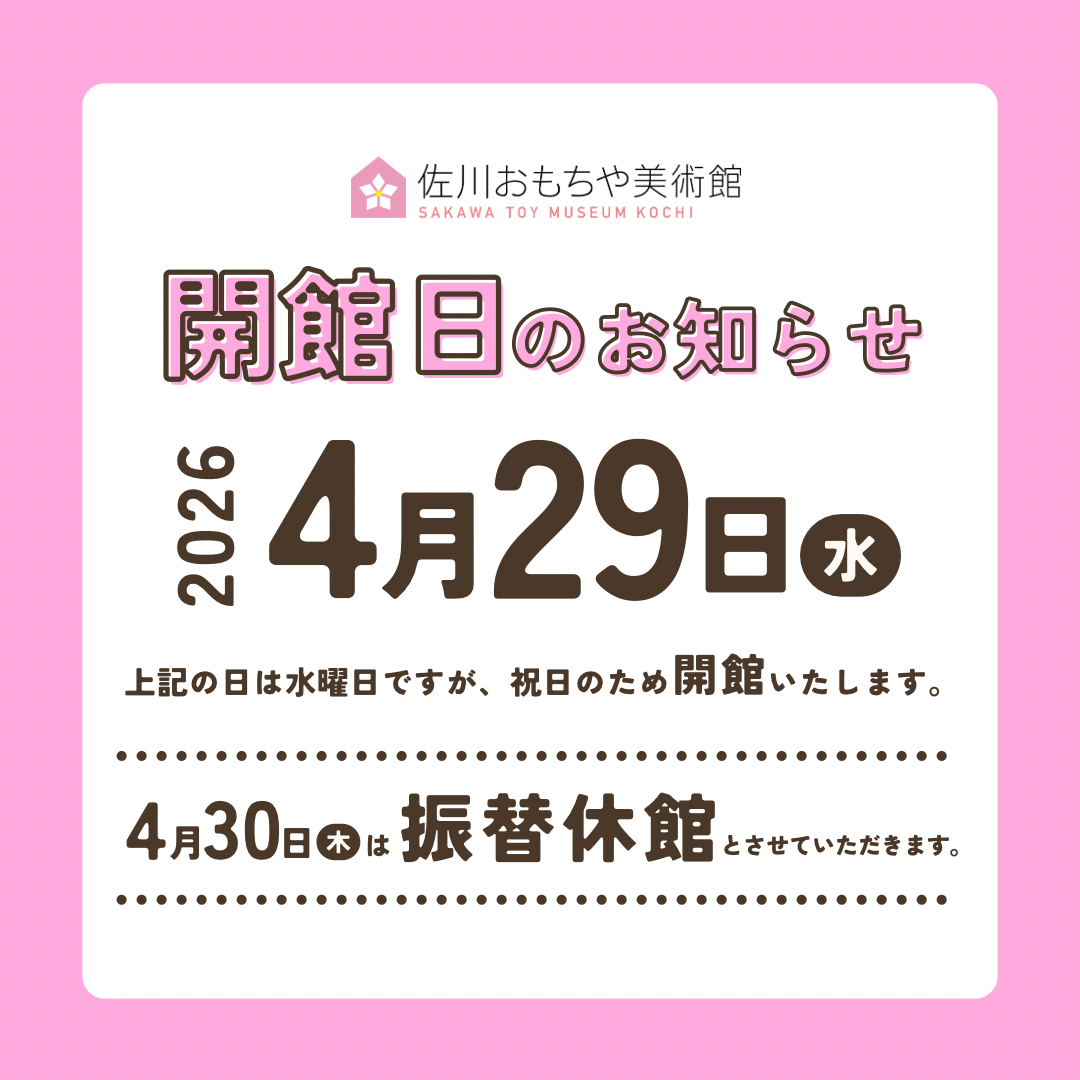 日ごろより、まきのさんの道の駅・佐川をご利用いただきありがとうございます。道の駅併設の「佐川おもちゃ美術館」について、2026年4月29日(水)は水曜日(通常休館日)ですが、祝日のため開館いたします。翌日4月30日(木)は振替休館とさせていただきます。ご来館予定のお客様はご注意くださいますようお願い申し上げます。★毎月のワークショップ情報や施設詳細などは佐川おもちゃ美術館 HPをご覧ください