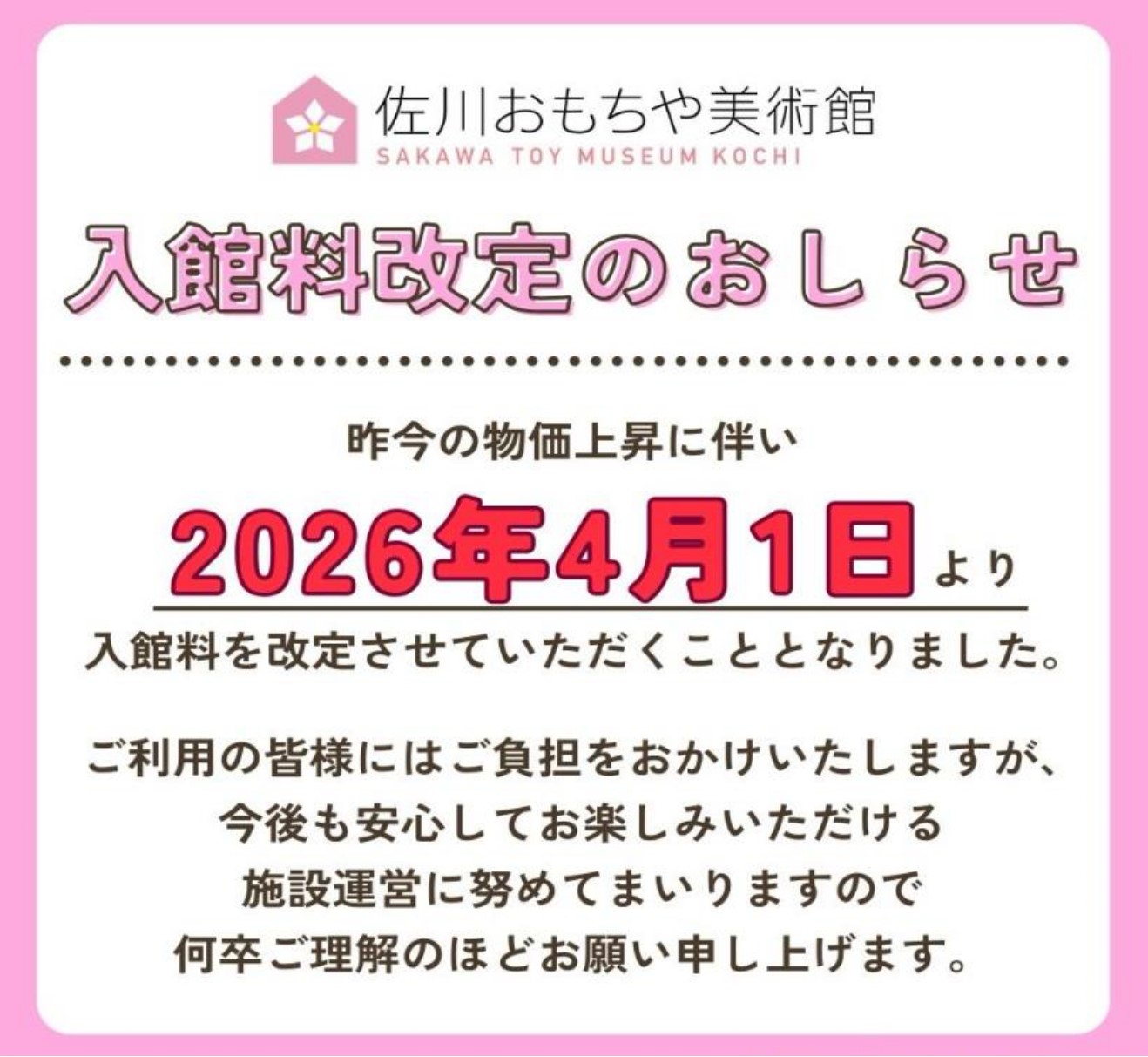 道の駅併設の「佐川おもちゃ美術館」について、昨今の物価上昇に伴い、2026年4月1日より入館料を改定させていただくこととなりましたので、お知らせいたします。